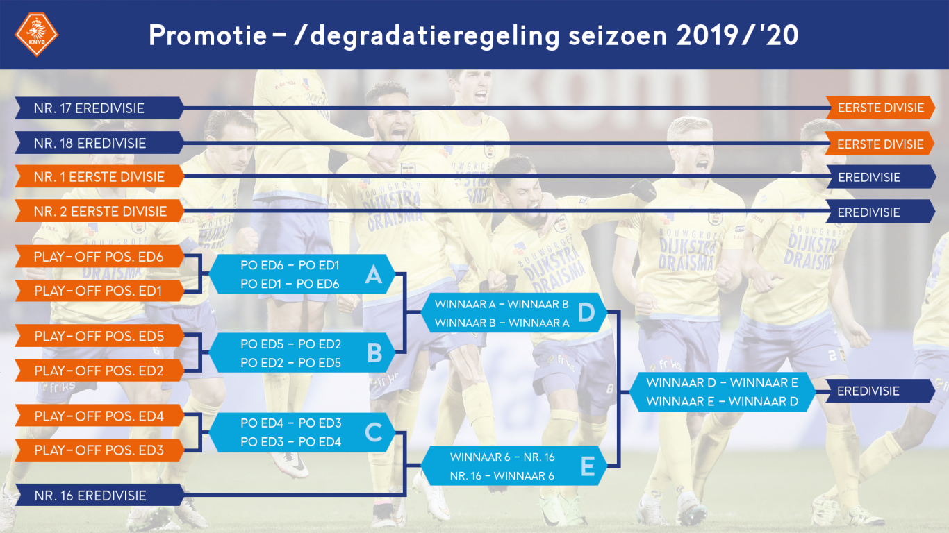Uit de veranderagenda komt ook de nieuwe promotie-/degradatieregeling voort. Twee clubs degraderen rechtstreeks uit de Eredivisie en twee clubs promoveren rechtstreeks uit de Keuken Kampioen Divisie. “Waar de afgelopen jaren acht clubs uit de Keuken Kampioen Divisie aan de play-offs voor promotie en degradatie deelnamen, worden dat er komend seizoen zes”, legt Bluyssen uit. Uit de Eredivisie krijgt alleen de nummer 16 de kans om zich via de play-offs te handhaven op het hoogste niveau.