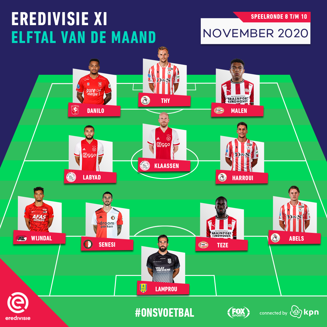 Het volledige Elftal van de Maand: Kostas Lamprou (RKC Waalwijk), Owen Wijndal (AZ), Marcos Senesi (Feyenoord), Jordan Teze (PSV), Dirk Abels (Sparta Rotterdam), Zakaria Labyad, Davy Klaassen (beiden Ajax), Abdou Harroui (Sparta Rotterdam), Danilo Pereira da Silva (FC Twente), Lennart Thy (Sparta Rotterdam) en Donyell Malen (PSV).