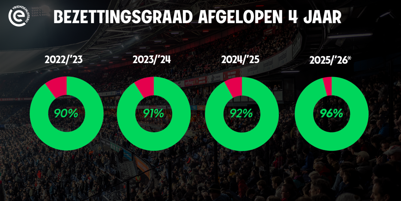 Met deze bezettingsgraad behoort de VriendenLoterij Eredivisie, samen met de Premier League en de Bundesliga, tot de best bezochte competities van Europa. De stijgende lijn is al langer zichtbaar: waar de bezettingsgraad in 2022/’23 nog 89% bedroeg, groeide deze vorig seizoen naar 93% en bereikt dit seizoen een nieuw hoogtepunt.