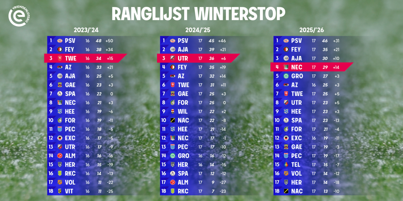 Na het zeventiende speelweekend zijn de kaarten voorlopig geschud. PSV is voor het derde jaar op rij winterkampioen, terwijl N.E.C. en FC Groningen het kalenderjaar knap afsluiten in de top 5. Telstar droeg op de laatste speeldag van de eerste seizoenshelft de rode lantaarn over aan NAC.