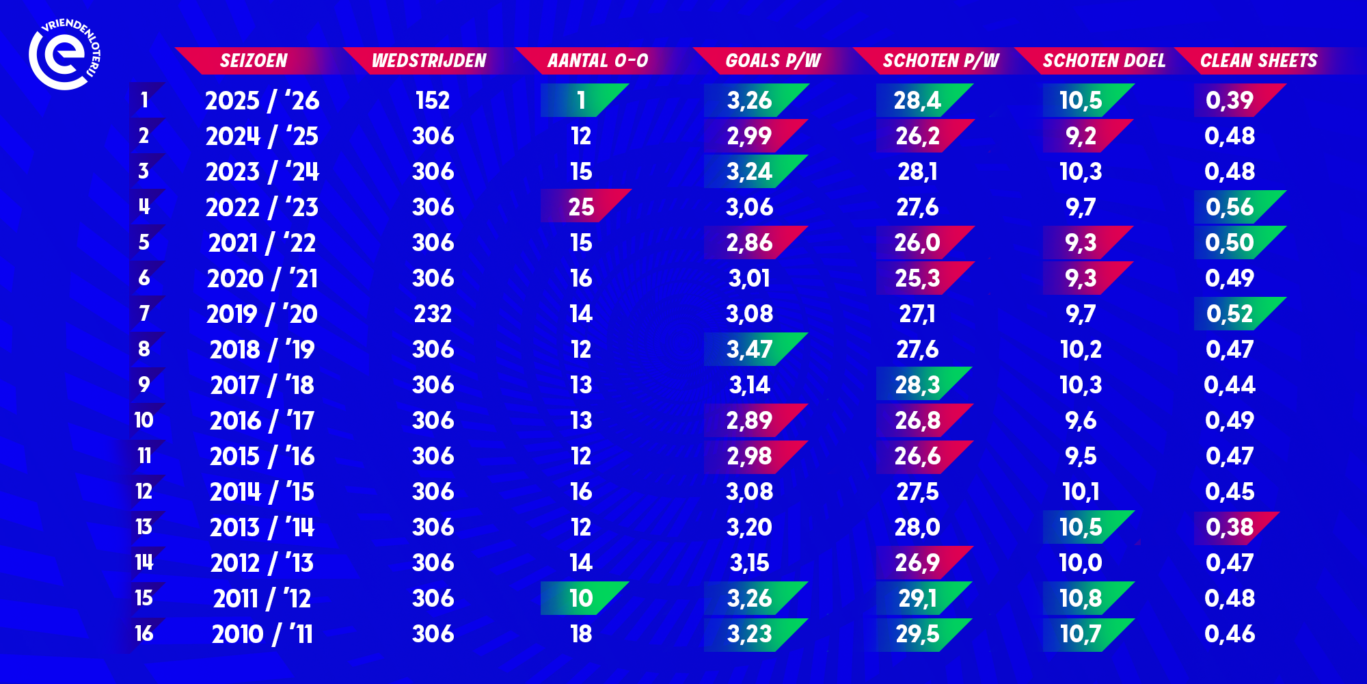 Het record voor het laagste aantal 0-0’s in één seizoen ligt daarmee binnen handbereik. In 1962/’63 eindigden slechts acht van de 240 wedstrijden in een brilstand. Ondanks het hogere aantal wedstrijden in het huidige competitieformat (306) behoort een nieuw record tot de mogelijkheden.