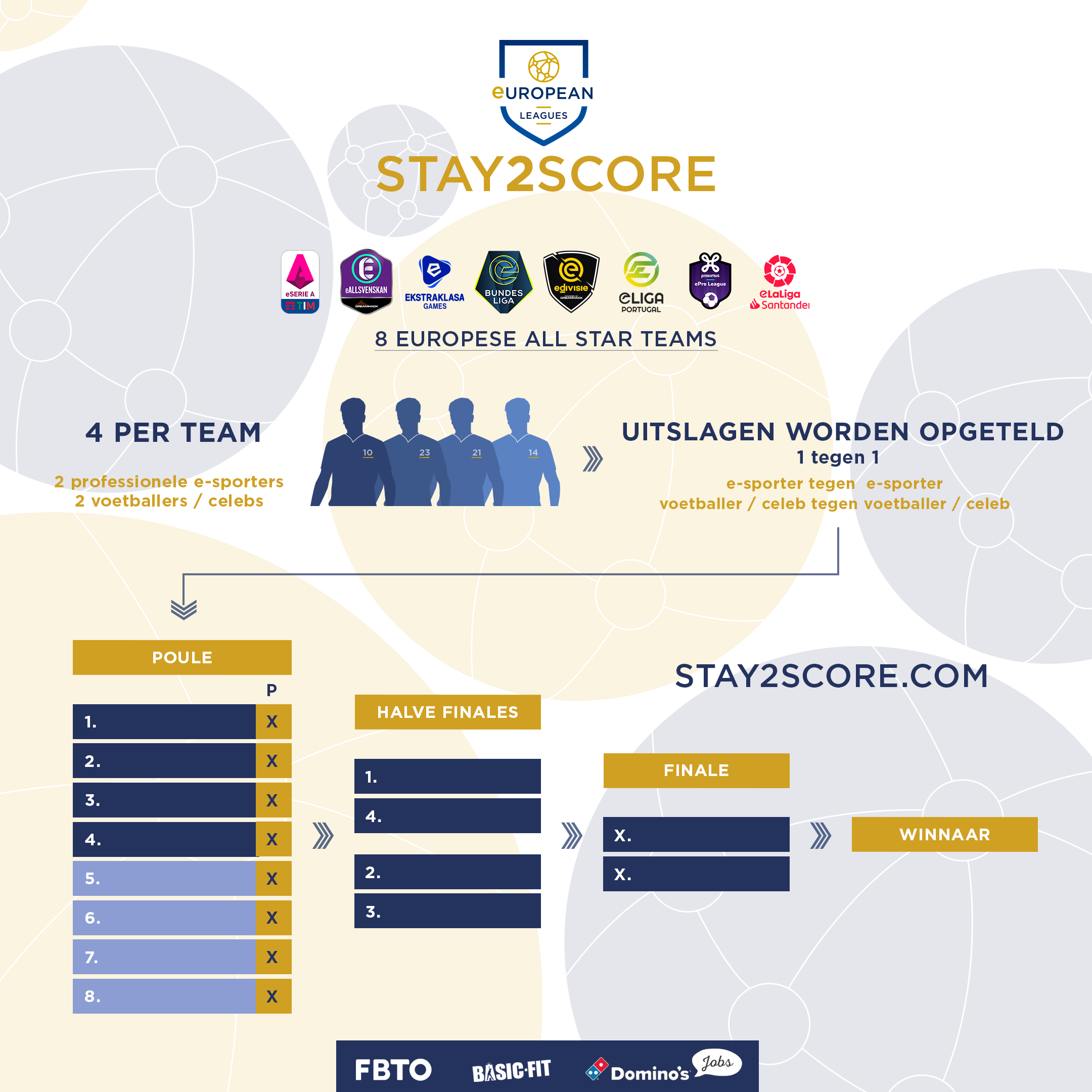 Met het stilvallen van het voetbal, biedt een groep van acht Europese voetbalcompetities, onder aanvoering van koepelorganisatie European Leagues, een vervangende vorm van entertainment aan haar jonge fans. In een online EA SPORTS FIFA20-toernooi nemen zij het tegen elkaar op in het 'Stay2Score'-toernooi.