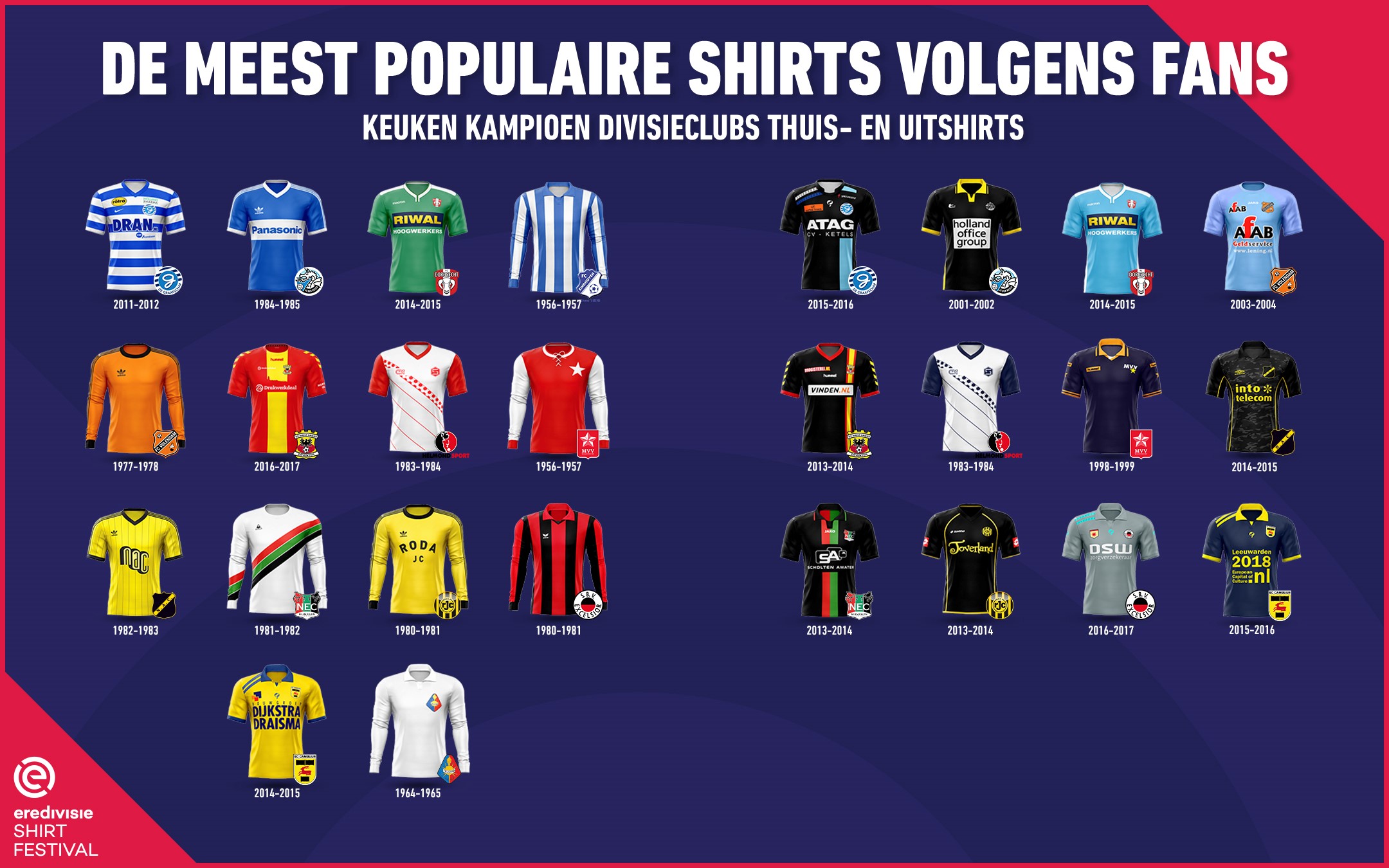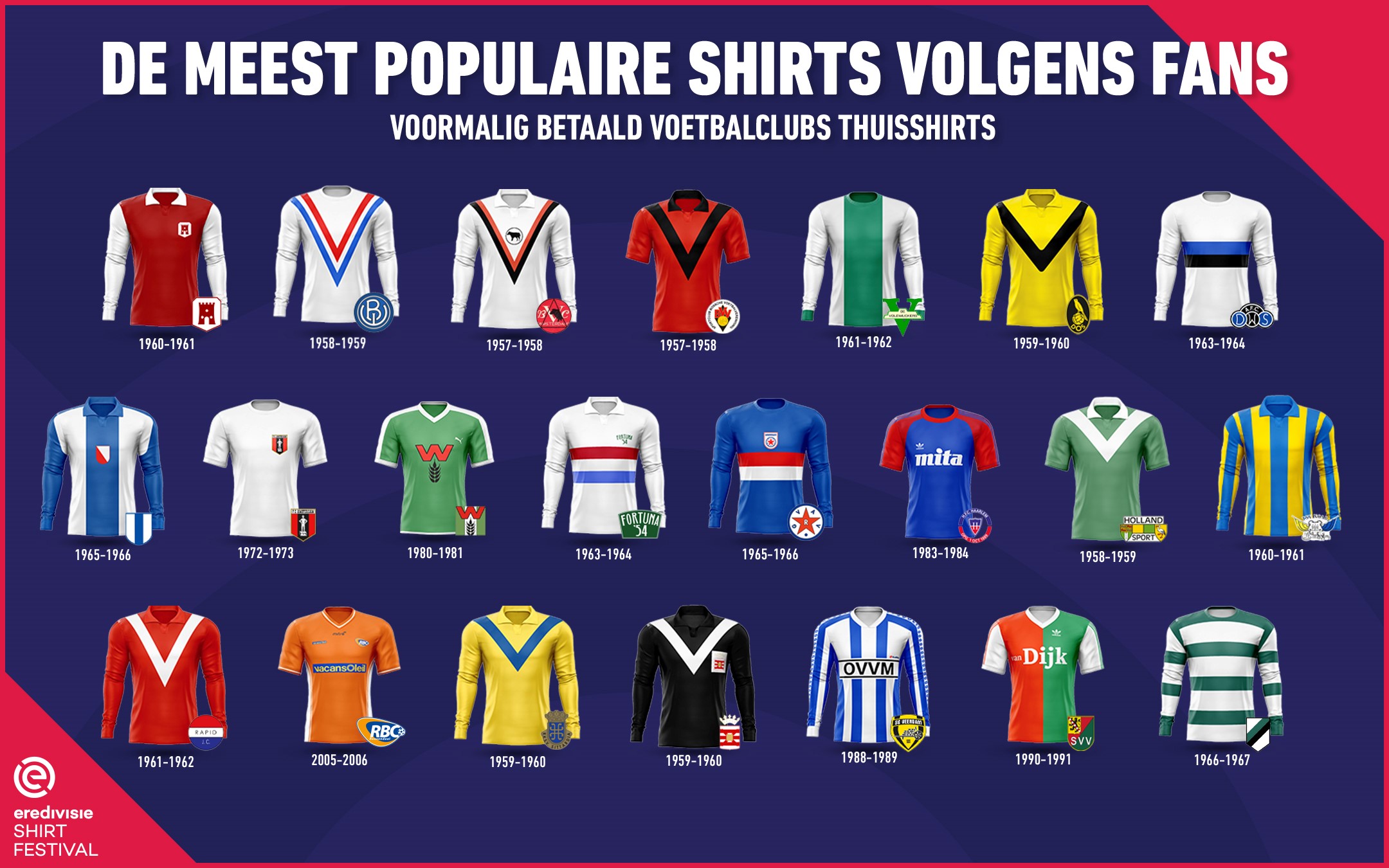 Op dinsdag 5 mei is door FOX Sports en AD bekendgemaakt wat de mooiste shirts zijn van de voormalig betaald voetbalclubs, zoals FC Wageningen, RBC Roosendaal en Xerxes / DHC '66. Op woensdag 6 mei volgden clubs uitkomend in de Keuken Kampioen Divisie en op donderdag 7 mei alle Eredivisieclubs. Bekijk hieronder de mooiste shirts volgens alle fans.