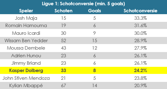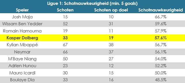 Tegen Lyon kwam Dolberg tot vier schoten, die allemaal tussen de palen waren. Dit is exemplarisch voor het seizoen van de Deen. Van zijn 33 schoten in de competitie waren er maar liefst 19 op doel, slechts drie spelers die minimaal vijf keer tot scoren kwamen in de Ligue 1 dit seizoen kunnen een betere schotnauwkeurigheid overleggen. Wat dit betreft blijft Dolberg topspelers als Kylian Mbappé en Neymar dus voor.