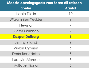 Dolberg maakt redelijk veel ‘belangrijke’ treffers voor zijn team. Zes van de acht doelpunten die hij dit seizoen noteerde waren de eerste goals van Nice in een duel.