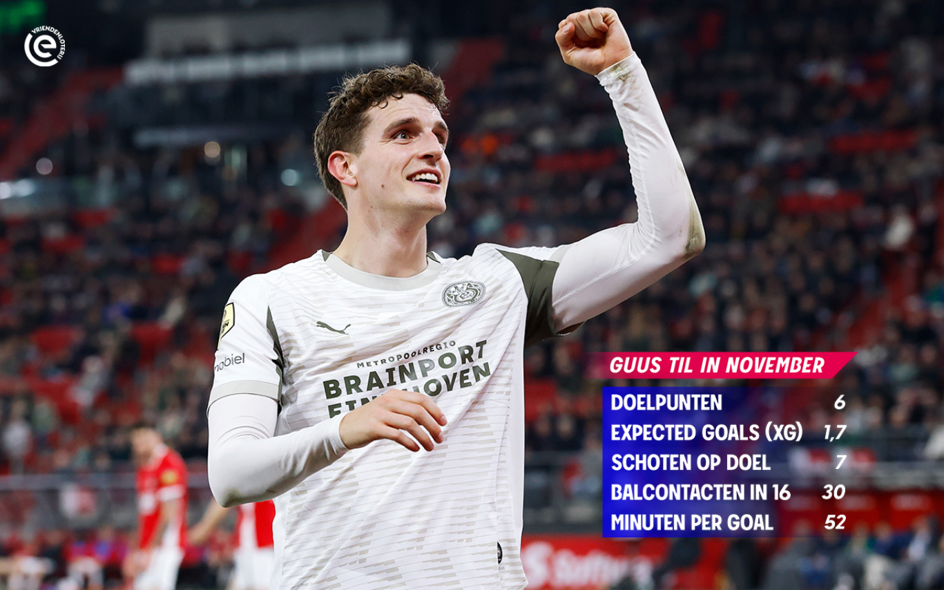 Guus Til scoorde in de afgelopen vier speelrondes zes doelpunten. Meer dan Jizz Hornkamp (5), Noah Naujoks (4) en iedere andere speler in de VriendenLoterij Eredivisie. Bijzonder is dat zijn Expected Goals (xG) in november slechts 1,7 bedroeg. Met andere woorden: hij maakte ruim vier doelpunten meer dan op basis van zijn kansen verwacht kon worden (+4,3). Til scoorde twee keer met het hoofd en vier keer met zijn rechtervoet.