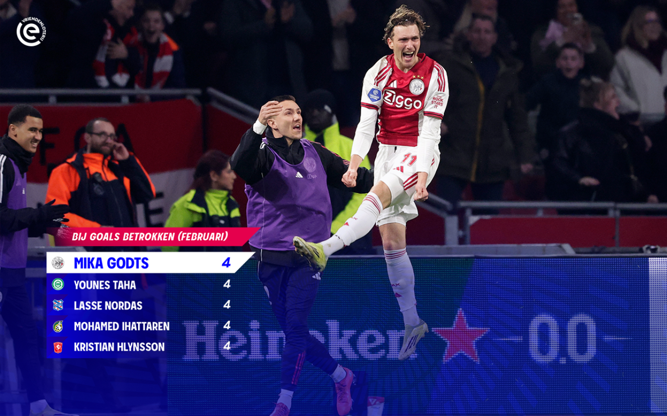Inmiddels staat de teller van Godts dit seizoen op dertien doelpunten (een-na-hoogste) en acht assists (twee-na-hoogste). De Ajacied is samen met Joey Veerman als MVP bij de meeste goals dit seizoen betrokken: 21 doelpunten.