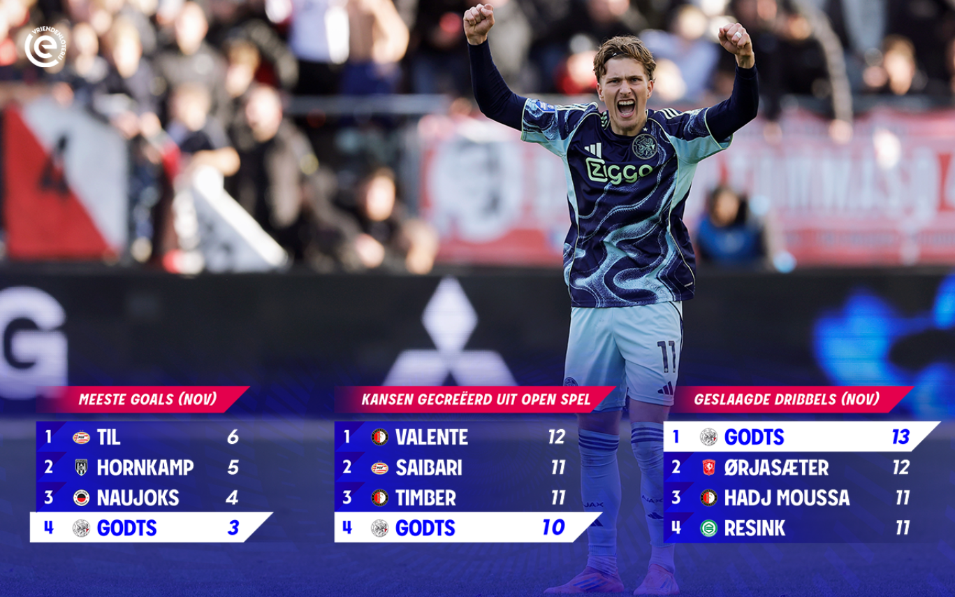 Daarnaast creëerde Godts tien kansen uit open spel, het vierde hoogste aantal in november. De linkeraanvaller mag zich bovendien met recht dribbelkoning noemen: dertien geslaagde dribbels, meer dan elke andere speler in de VriendenLoterij Eredivisie.