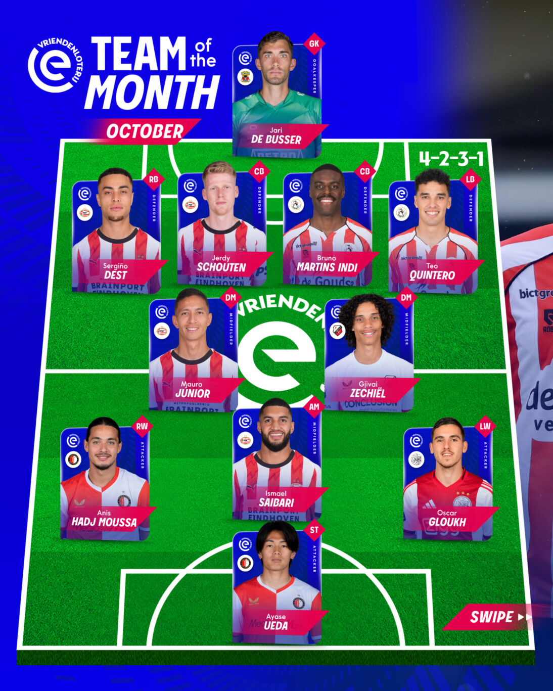 Het volledige Elftal van de Maand oktober: Jari De Busser (Go Ahead Eagles), Sergiño Dest (PSV), Jerdy Schouten (PSV), Bruno Martins Indi (Sparta Rotterdam), Teo Quintero (Sparta Rotterdam), Mauro Júnior (PSV), Gjivaj Zechiël (FC Utrecht), Anis Hadj Moussa (Feyenoord), Ismael Saibari (PSV), Oscar Gloukh (Ajax) en Ayase Ueda (Feyenoord).