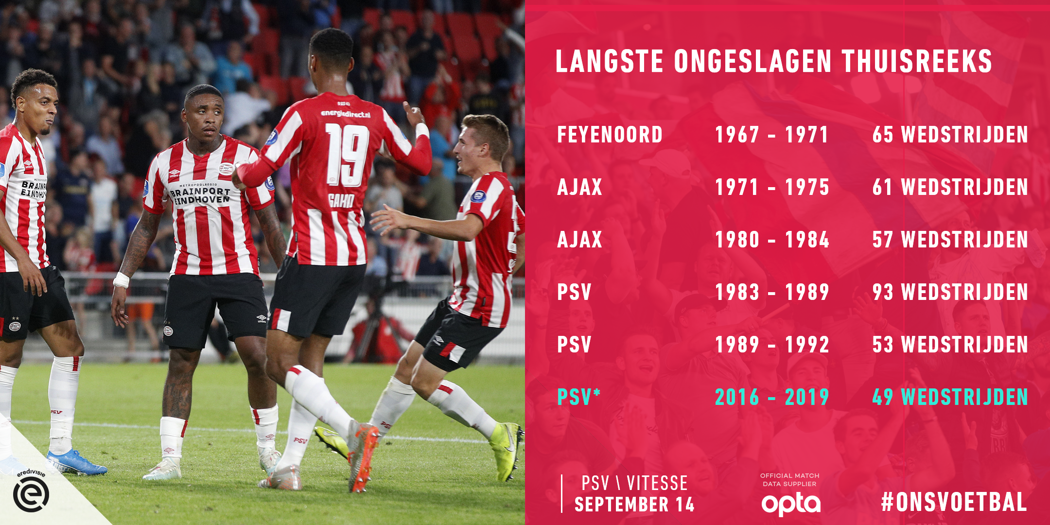 Op 18 september 2016 verloor de ploeg voor het laatst een Eredivisiewedstrijd in eigen huis, toen was Feyenoord met 0-1 te sterk voor de Eindhovenaren. Sindsdien won PSV 44 van de 49 competitieduels die ploeg speelde in het Philips Stadion (G5).