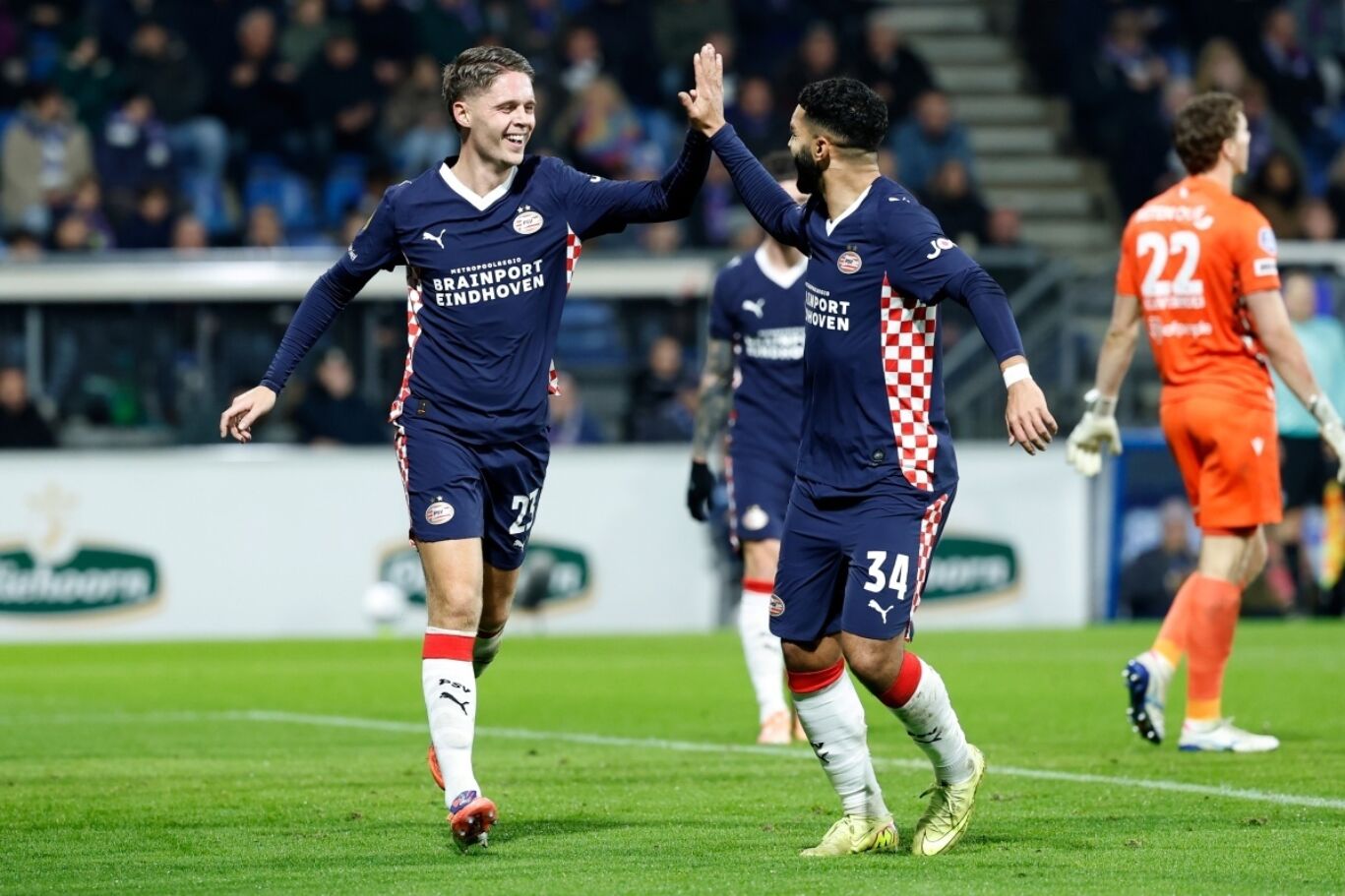 Joey Veerman en Ismael Saibari juichend tegen sc Heerenveen.