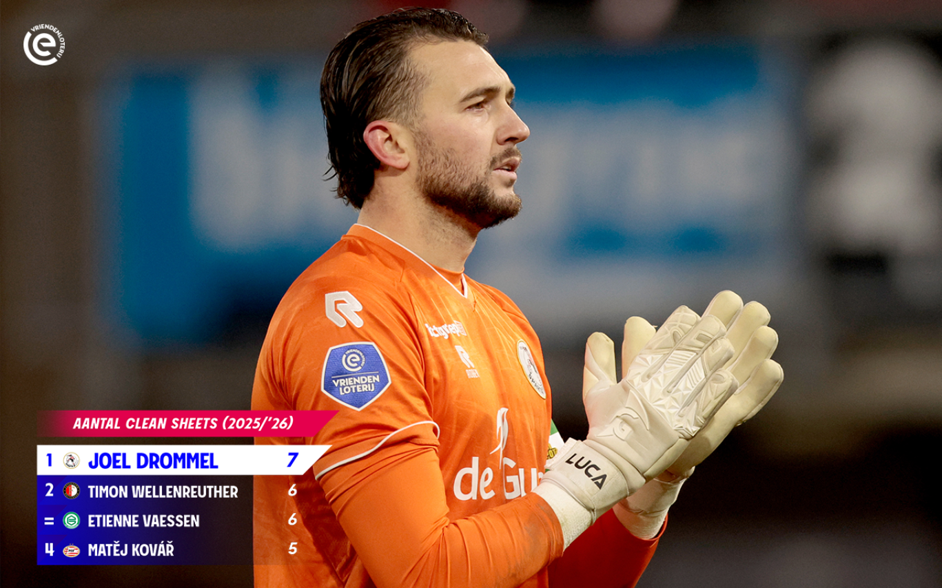 Afgelopen zondag won Sparta Rotterdam met 2-0 van Heracles Almelo. Voor de zevende keer dit seizoen hielden de Spartanen de nul. Een knappe prestatie: met zeven clean sheets wist keeper Joel Drommel het vaakst zijn doel schoon te houden. Meer dan iedere andere keeper en club in de VriendenLoterij Eredivisie. Timon Wellenreuther (Feyenoord) en Etienne Vaessen (FC Groningen) volgen beiden met zes clean sheets. Bijzonder: met zeven clean sheets wist Drommel al vaker de nul te houden dan Nick Olij het gehele vorige eredivisieseizoen bij Sparta (6 clean sheets).