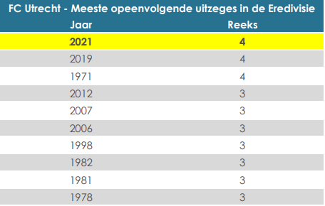 Na de nederlaag in Arnhem, won FC Utrecht de uitwedstrijden bij AZ, Willem II, RKC Waalwijk én Fortuna Sittard. De reeks van vier opeenvolgende uitzeges in de Eredivisie is al bijzonder voor de ploeg uit de Domstad. Utrecht deed dat namelijk pas twee keer eerder! Redelijk recent lukte dit in 2019, de eerste keer dat FC Utrecht buitenshuis vier keer op rij won was in 1971.