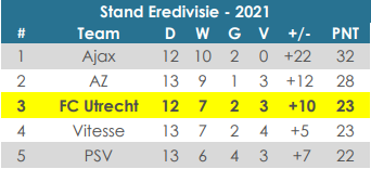 De vorm die de Domstedelingen in 2021 etaleren staat in schril contrast met die van voor de winterstop. Na zeventien punten uit de eerste veertien duels volgden 23 punten uit de twaalf duels daarna. Dit kalenderjaar pakten alleen Ajax (32) en AZ (28) meer punten in de Eredivisie dan FC Utrecht (23), terwijl Vitesse met een wedstrijd meer gespeeld op gelijke hoogte staat.