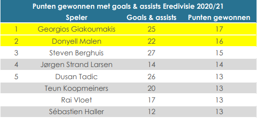 Een andere manier om de productie van spelers te beoordelen is door te kijken naar hoeveel punten deze goals en assists opleverden. In onderstaande tabel pakt een speler punten dankzij doelpunten en assists die, als hadden deze niet plaatsgevonden, niet zouden zijn veroverd door het team van de speler. Op basis daarvan was Malen al zestien punten waard voor PSV, slechts één minder dan Giakoumakis voor VVV. Na het duel tussen VVV en PSV zou er dus zomaar eens een nieuwe koploper in dit klassement kunnen zijn.