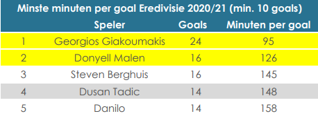 Donyell Malen had afgelopen week tegen Heracles Almelo weer een cruciale rol door de openingstreffer tegen Heracles Almelo aan te tekenen. Georgios Giakoumakis is momenteel twee wedstrijden zonder een treffer en wist niet te scoren met zijn laatste zes doelpogingen. Desondanks heeft de Griek van alle spelers met minimaal tien goals nog het beste minuten-per[1]doelpunt-gemiddelde, ruim voor de runner-up Donyell Malen.