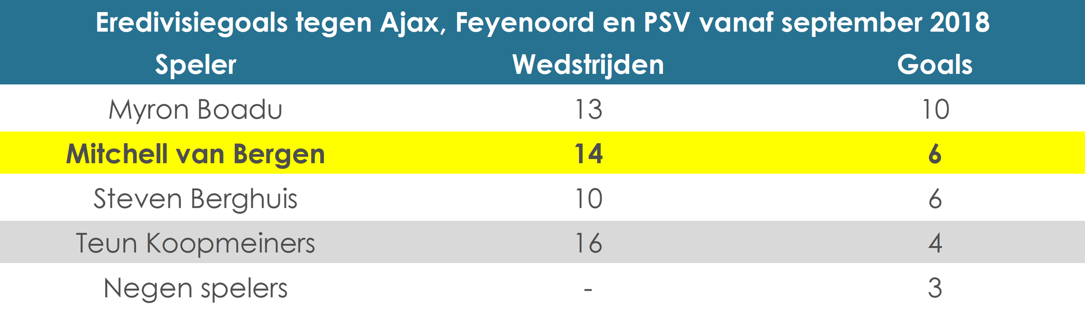 Sowieso doet Heerenveen het de laatste tijd prima tegen hooggeklasseerde teams. De ploeg was trefzeker in de laatste elf Eredivisieduels met teams die aan het begin van de speeldag in de top-3 stonden en verloor maar één van vier dergelijke duels dit seizoen (W1, G2). Een opvallende speler hierbij is Mitchell van Bergen. Sinds zijn debuut voor sc Heerenveen in 2018 maakte alleen Myron Boadu meer Eredivisiegoals tegen de traditionele top-3 (10) dan de rappe buitenspeler (6, gedeeld met Steven Berghuis). Van Bergen kwam dit seizoen pas vier keer tot scoren, maar drie van die treffers waren tegen Ajax, Feyenoord en PSV.