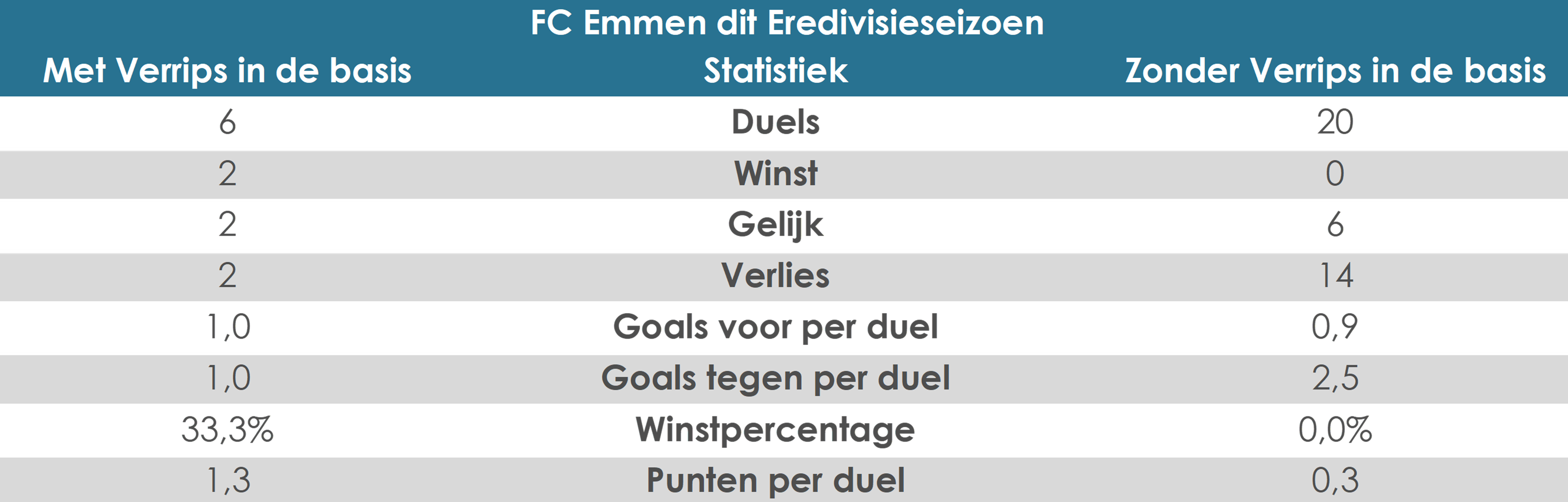 FC Emmen is aan een opmars bezig. De ploeg bleef in de laatste vier Eredivisiewedstrijden ongeslagen (W2, G2) en kan de vierde ploeg deze eeuw worden die vijf wedstrijddagen op rij begint als hekkensluiter en in die reeks ongeslagen blijft (eerder De Graafschap in 2002/03, FC Volendam in 2008/09 en Roda JC in 2016/17). De sterke reeks is moeilijk los te zien van de komst van Michael Verrips. De doelman maakte begin maart een blunder tegen Sparta, maar is verder bezig aan een zeer indrukwekkende serie. Met de doelman in de basis pakt Emmen gemiddeld een punt meer per competitieduel dan zonder hem, terwijl er gemiddeld gezien liefst 1,5 goals minder geincasseerd worden.