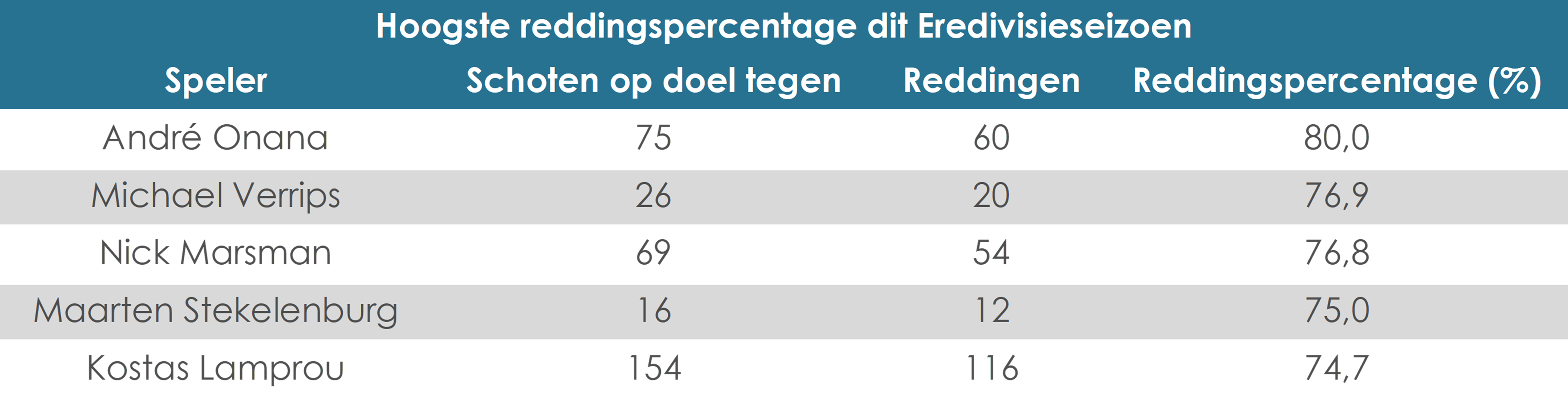 Dit Eredivisieseizoen noteert alleen André Onana (80%) een hoger reddingspercentage dan Verrips, die twintig van de 26 schoten die hij tegenkreeg wist te stoppen (76,9%). Ook bij tegenstander Feyenoord heeft men een keeper in vorm. Nick Marsman leek toch vooral een stand-in voor Justin Bijlow te zijn, maar inmiddels maakt hij het trainer Dick Advocaat lastig. Wat betreft reddingspercentage doen alleen Onana en Verrips het deze Eredivisiecampagne beter dan Marsman (76,8%).