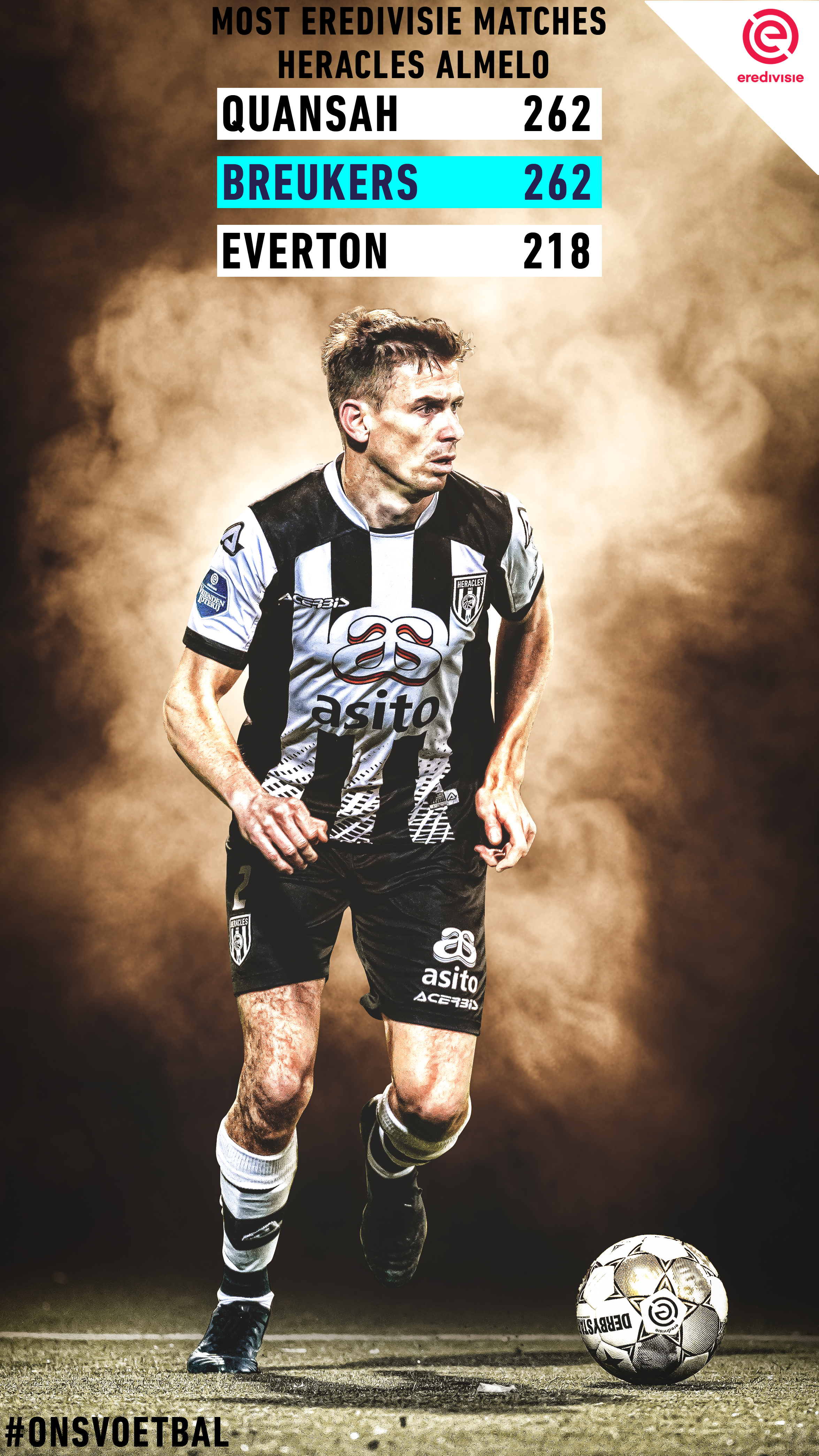 Aan zijn Eredivisiedebuut wil Tim Breukers waarschijnlijk niet te vaak herinnerd worden. Op 2 december 2007 viel de verdediger namens Heracles na 34 minuten in op bezoek bij Feyenoord. Op dat moment stonden de Rotterdammers met 2-0 voor. Eindstand, 6-0. Inmiddels staat de teller voor Breukers op 262 Eredivisieduels voor de Heraclieden en gaat hij tegen Vitesse op recordjacht.