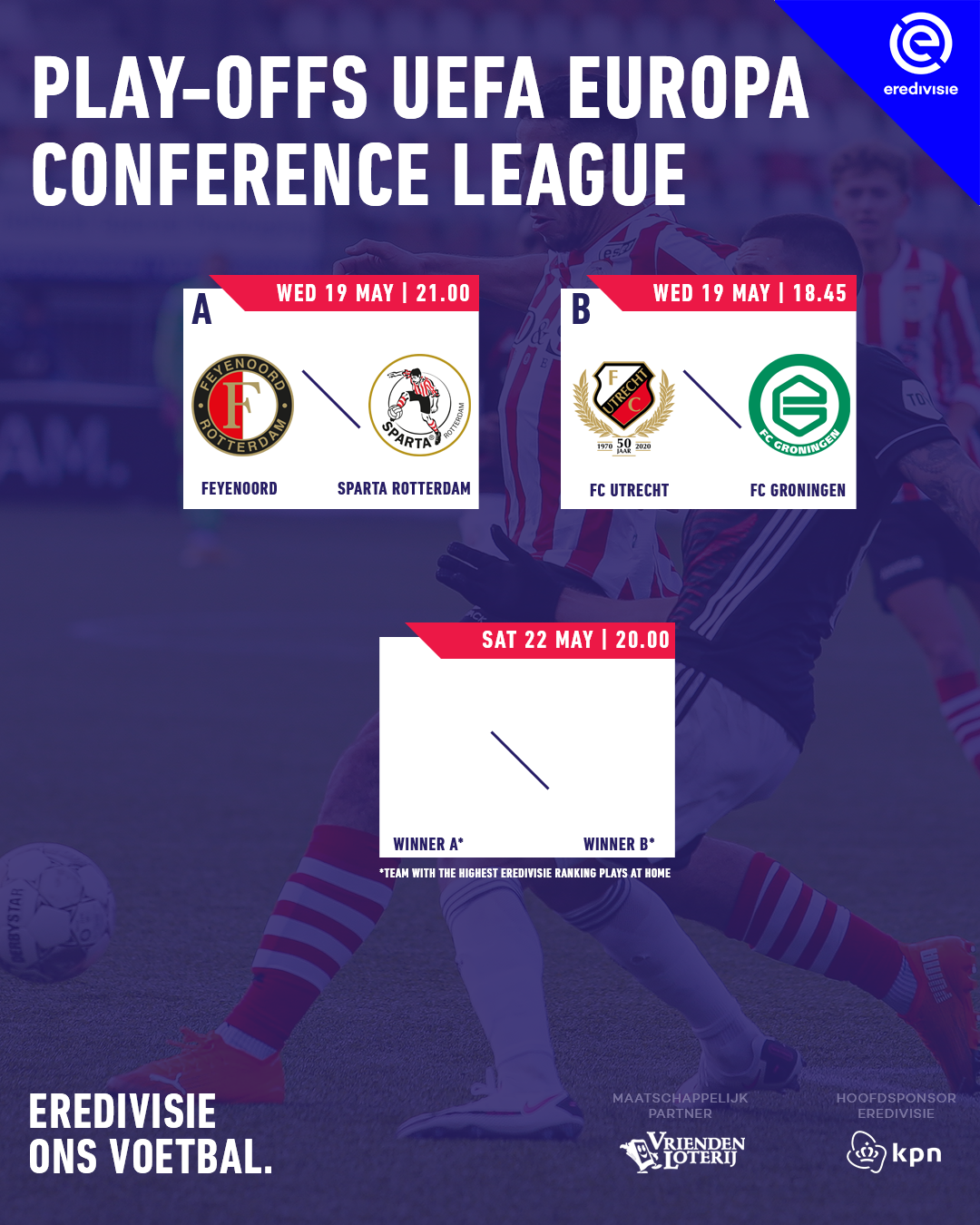 Op woensdag 19 mei worden de play-offs voor Europees voetbal afgetrapt. Feyenoord en Sparta Rotterdam zullen uitmaken wie dit jaar dé club van Rotterdam is. In Utrecht wordt het duel tussen FC Utrecht en FC Groningen afgewerkt.