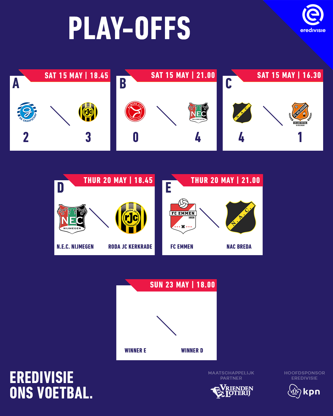 De eerste ronde van de nacompetitie play-offs heeft reeds plaatsgevonden. Roda JC Kerkrade, N.E.C. Nijmegen en NAC Breda hebben deze ronde overleefd. Samen met de nummer 16 van de Eredivisie, FC Emmen, staan zij donderdag 20 mei in de halve finale van de nacompetitie play-offs.