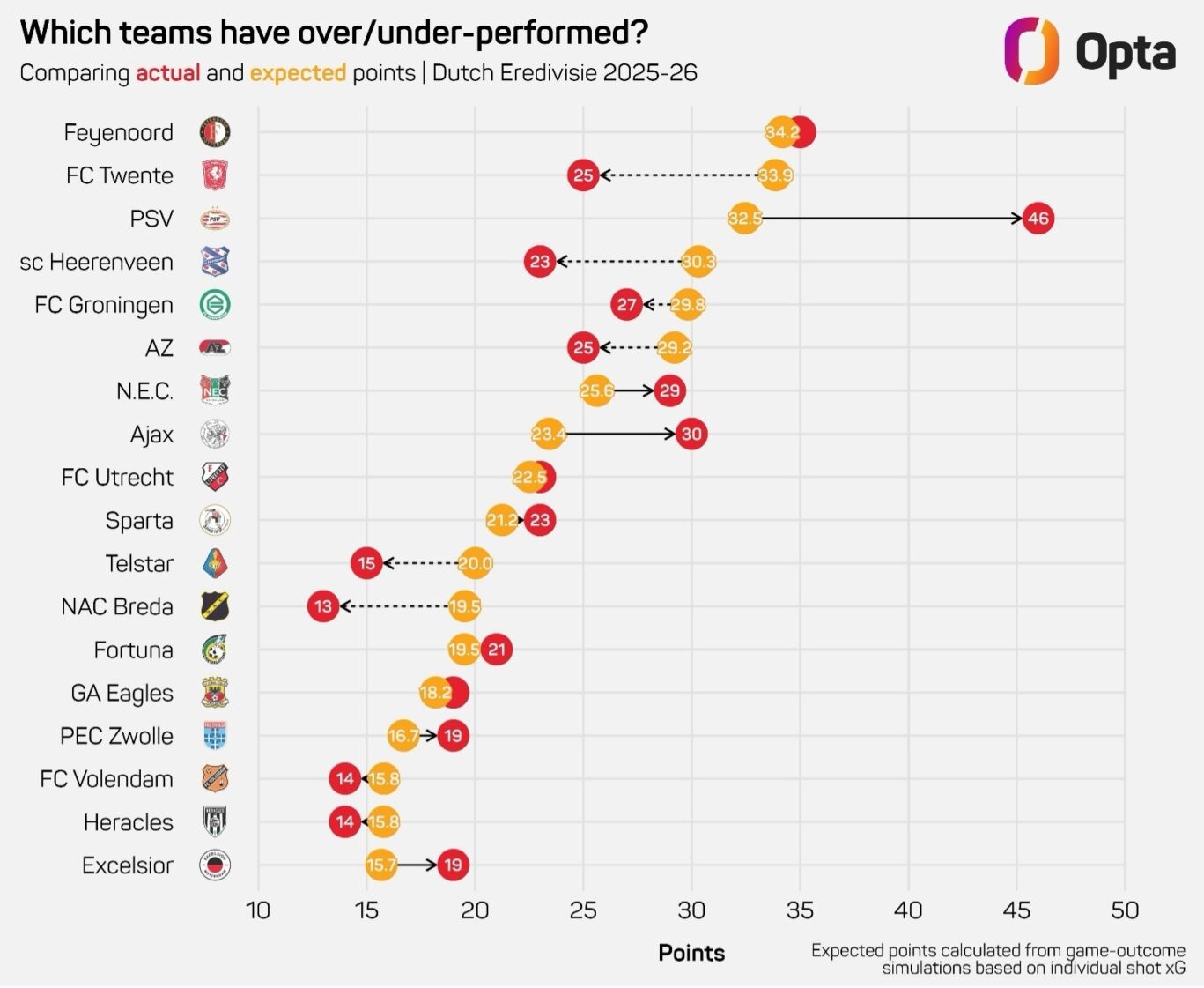 Bij NAC Breda en Telstar overheerst vooral teleurstelling over de huidige positie op de ranglijst. Het spel van beide ploegen is beter dan het puntenaantal doet vermoeden. Telstar verloor al vijf eredivisieduels waarin het meer schoten loste dan de tegenstander, alleen sc Heerenveen overkwam dit vaker. Ook NAC verloor al vier keer ondanks een overwicht in doelpogingen. Volgens Opta’s Expected Points-model hadden Telstar en NAC recht op respectievelijk de elfde en twaalfde plek, wat aangeeft dat beide ploegen met hun spel eigenlijk boven de degradatiestreep thuishoren.